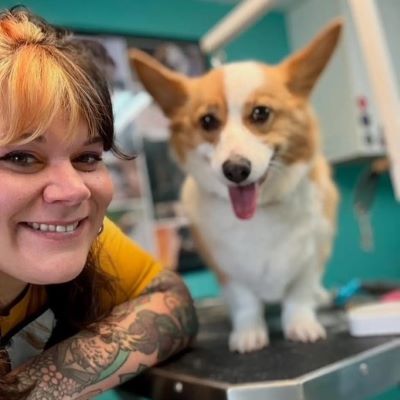 I’ve been grooming dogs for almost 15 years, and I still feel lucky every day that I get to be around them for work. I love getting creative with grooms—especially on those special breeds that let their personality shine through. At home, I’ve got a fun crew: three dogs—Boh the Boxer, Rosie the Pug, and Rubble, our Boxer/Pug mix—plus two cats, Marsha and Cash. In my free time, I love making art and hanging out with my husband and our pack.